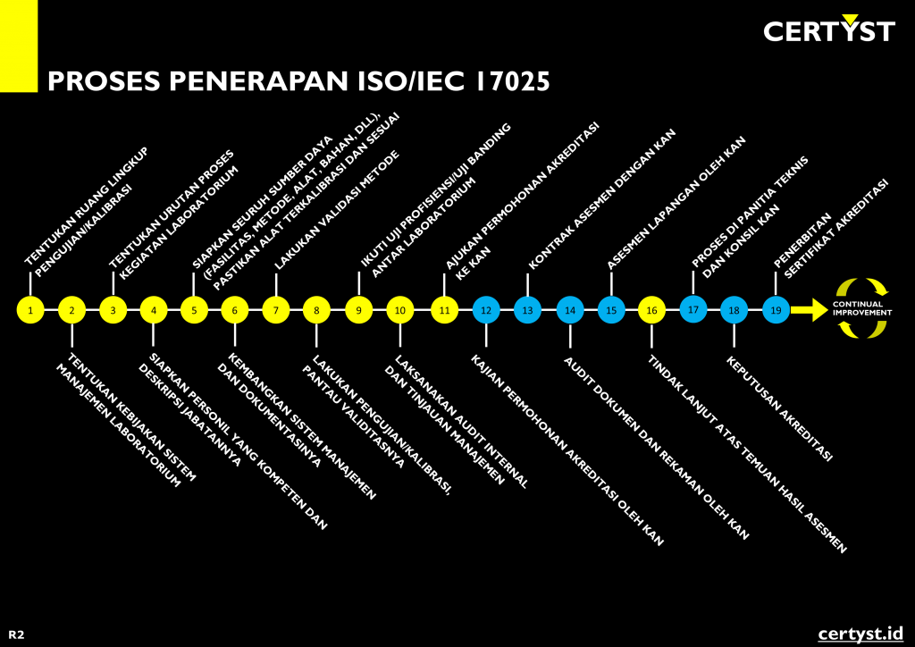 Infografis yang berisi tahapan dalam Proses Penerapan ISO/IEC 17025 dari Gap Analysis Audit hingga Penerbitan Sertifikat Akreditasi KAN. Banyaknya tahapan dan durasi pelaksanaan bergantung pada kesiapan dan sumber daya laboratorium.